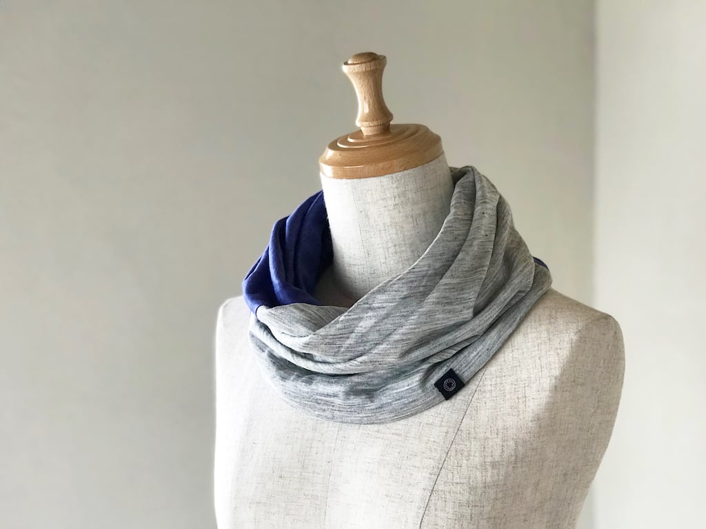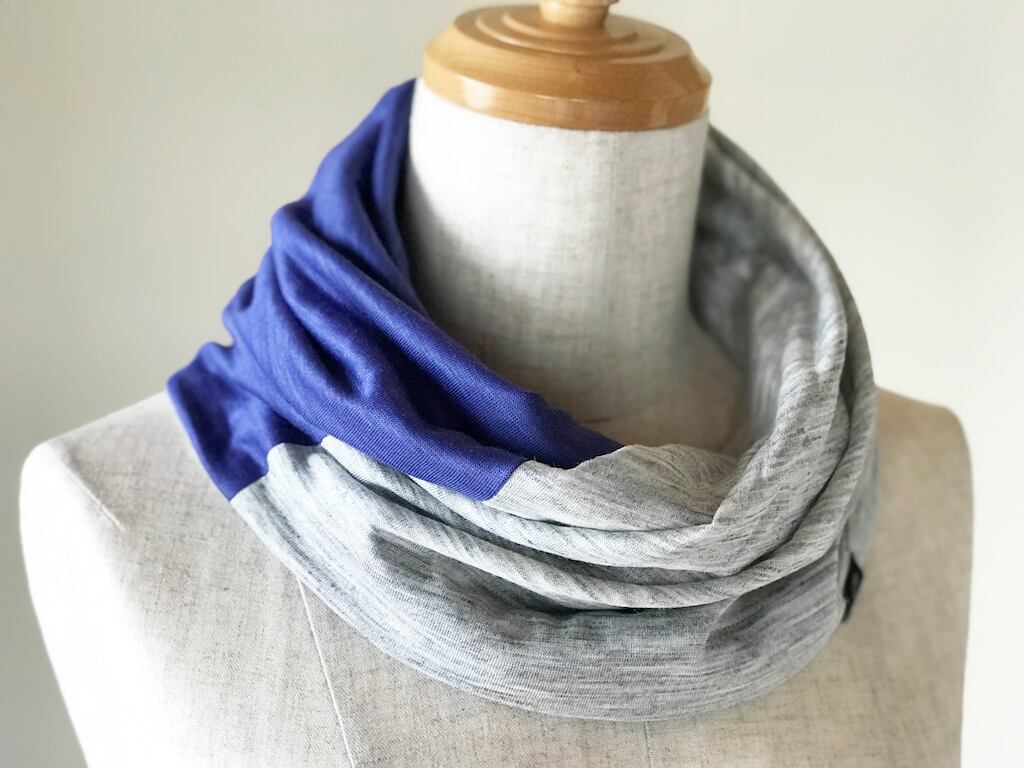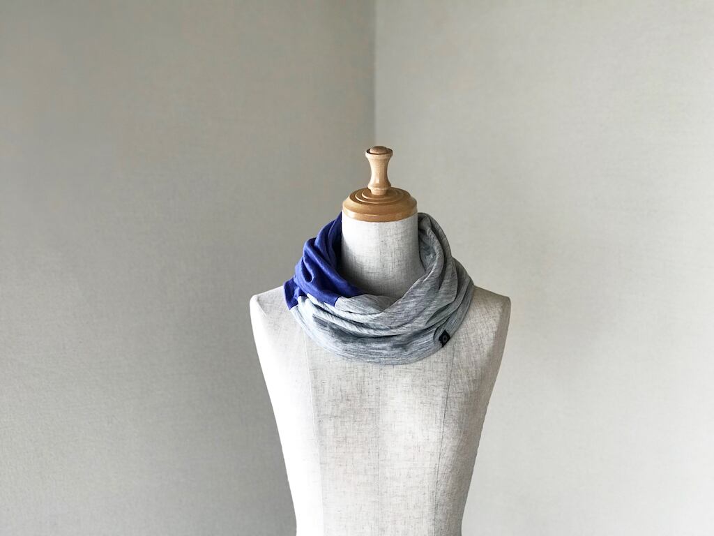 麻のねじりスヌード ブルー×グレーのコンビ