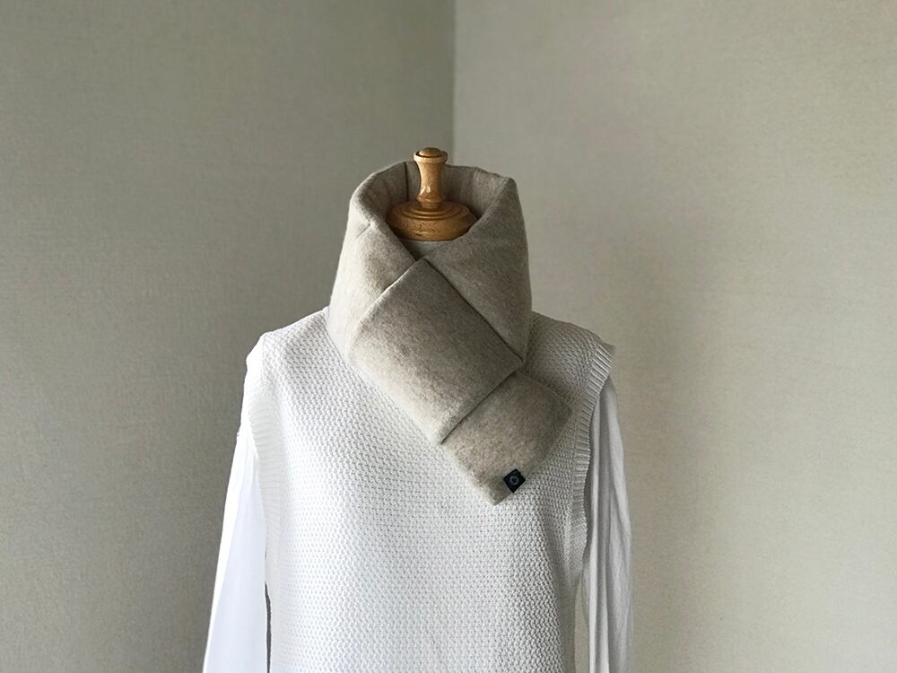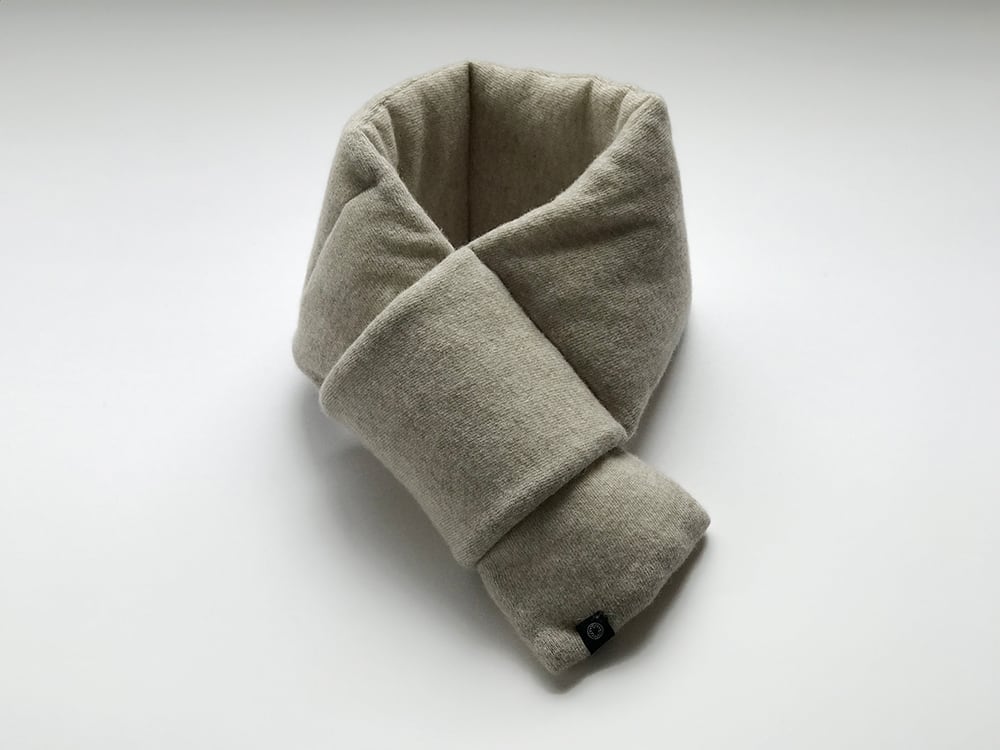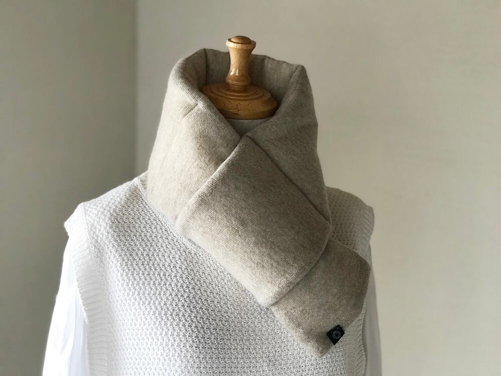 design:ふわふわ純カシミヤ素材で高機能中綿素材を包込み、手軽に暖かさを持ち運べるコンパクトなマフラーです。