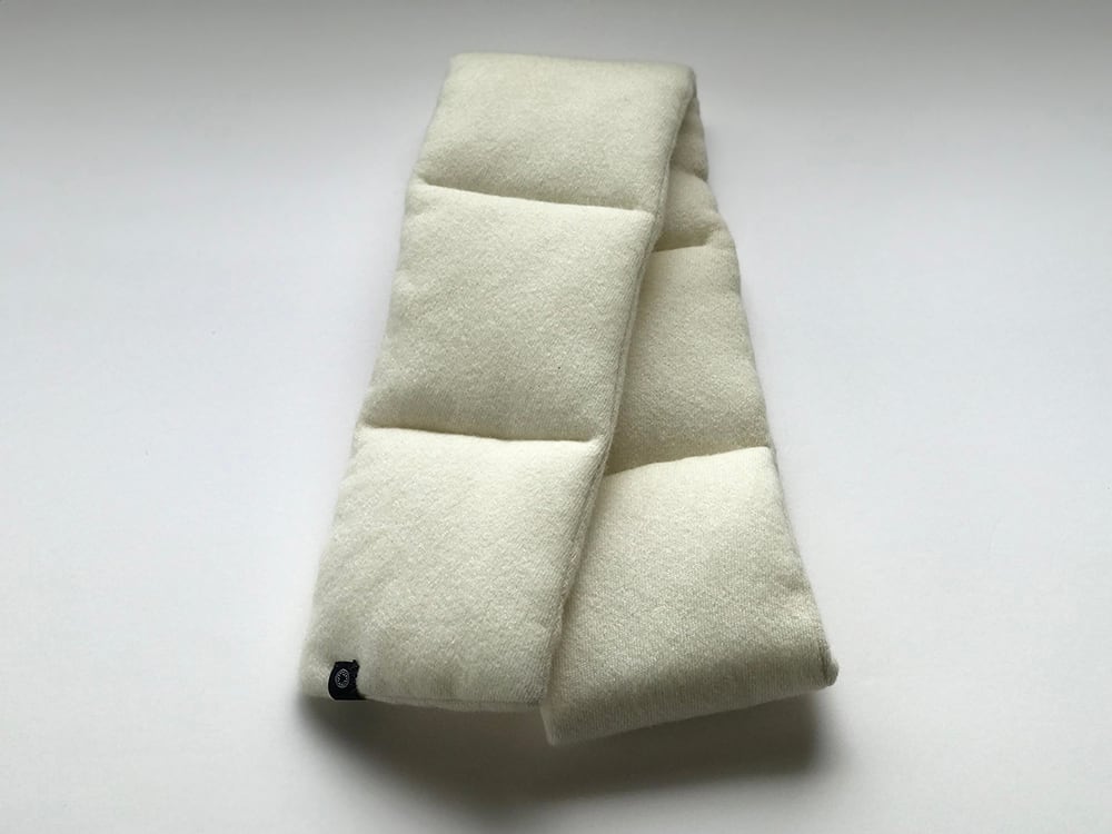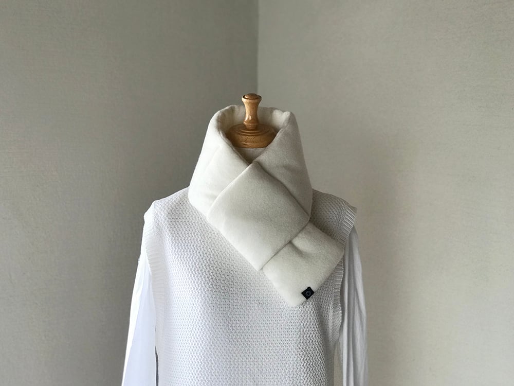 design:ふわふわ純カシミヤ素材で高機能中綿素材を包込み、手軽に暖かさを持ち運べるコンパクトなマフラーです。