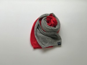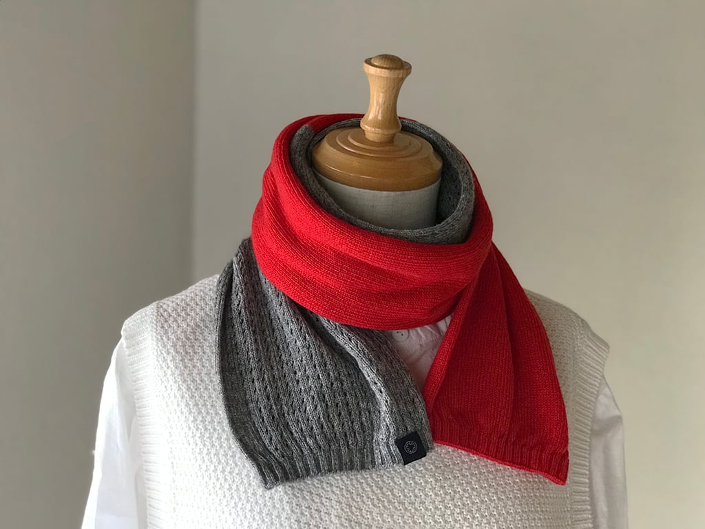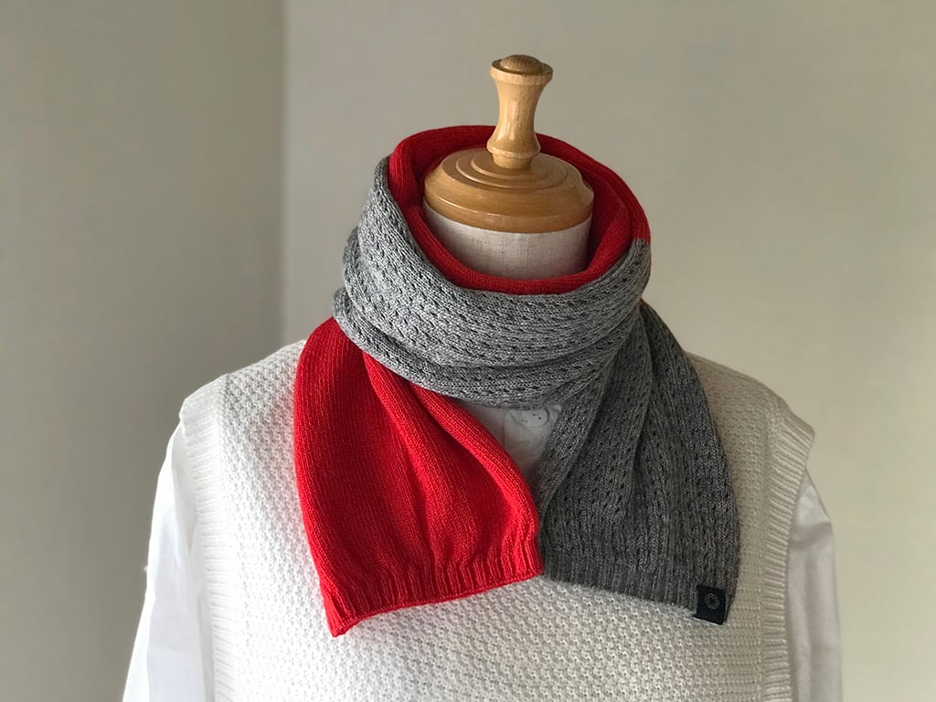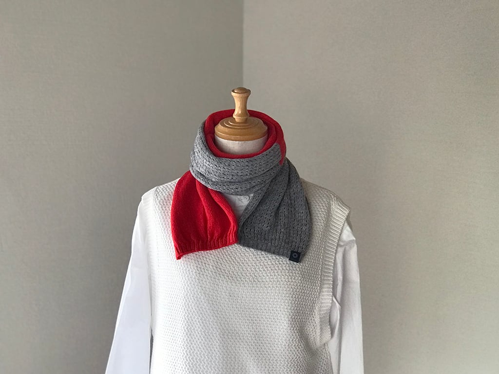 Design:無地と少しだけ透けのあるメッシュを配色にして、筒で編み上げた収まりの良いマフラーです。