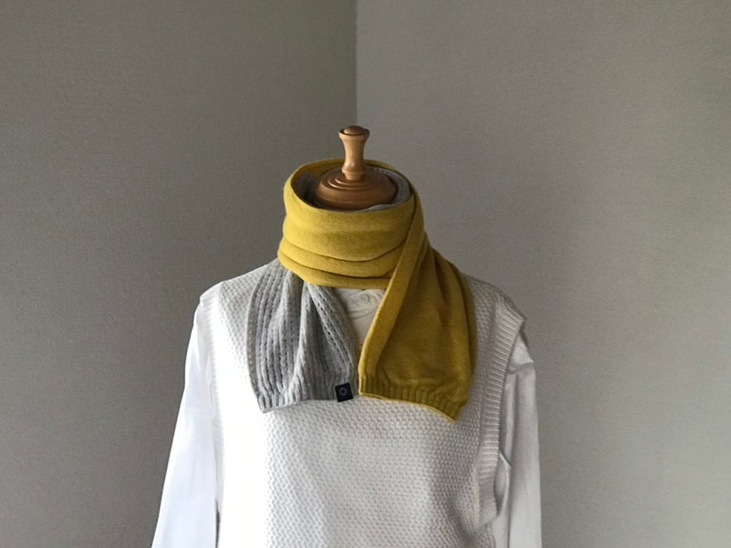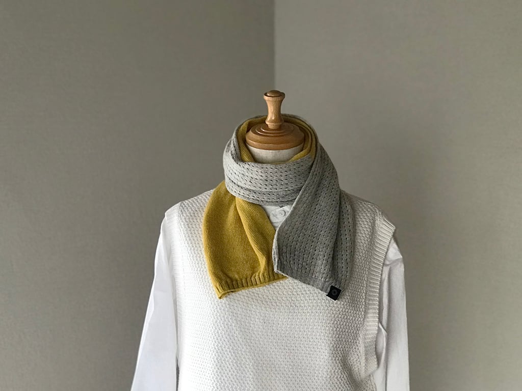Design:無地と少しだけ透けのあるメッシュを配色にして、筒で編み上げた収まりの良いマフラーです。