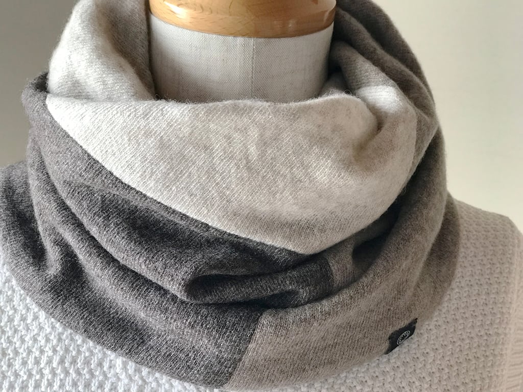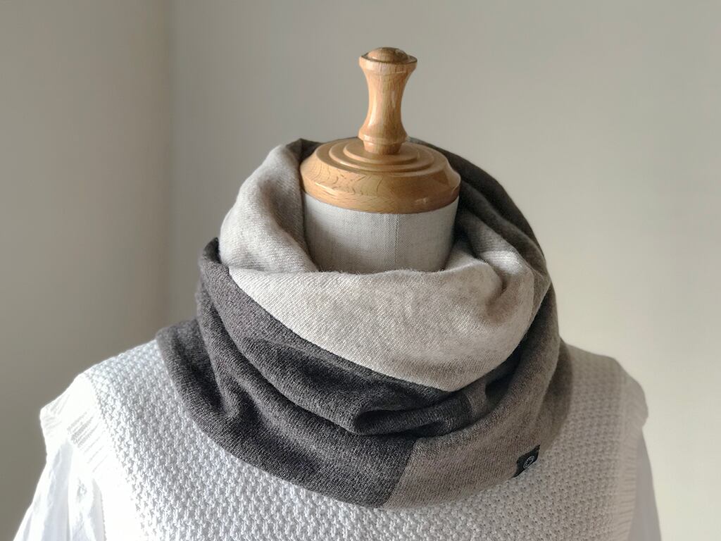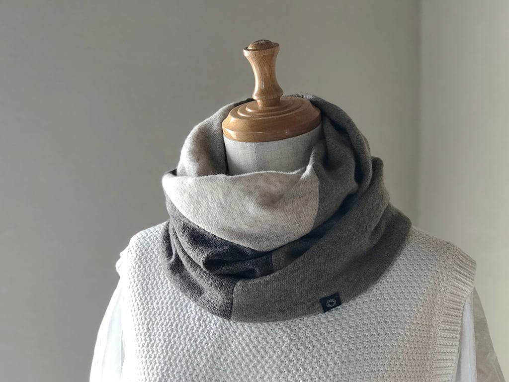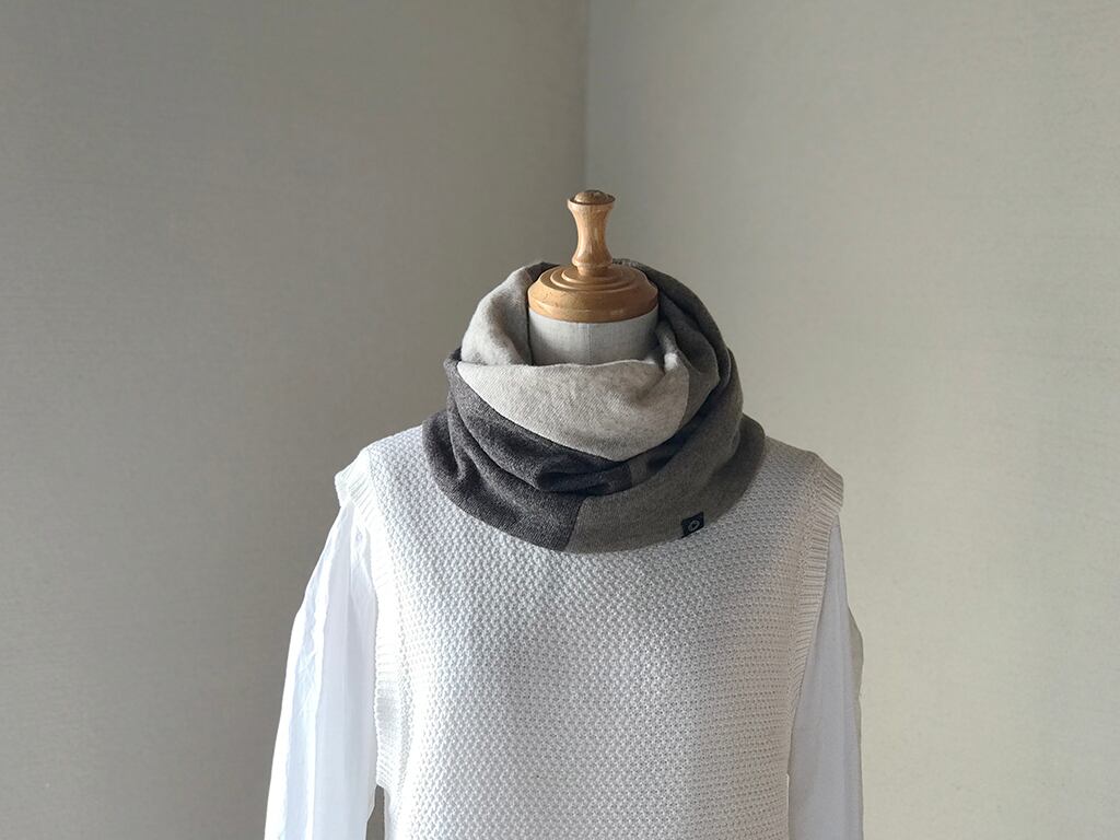 Design:素材を積み木のように接ぎ合わせたスヌード。
